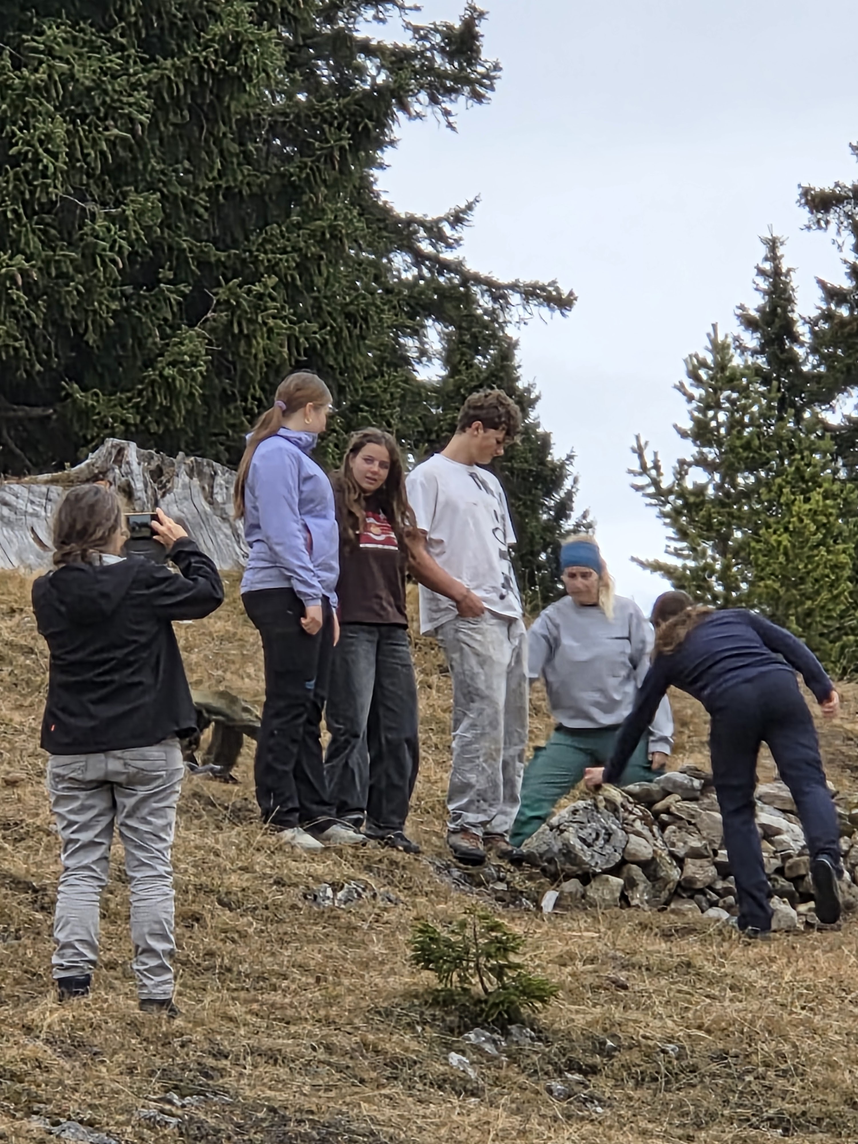 Wir waren insgesamt 5 Erwachsene und fünf Jugendliche, die die Standorte für die Trockenmauern und Steinhaufen, bzw. die Benjes Hecke aussuchten und auch gleich mit den Arbeiten begannen. Einen Steinhaufen errichteten wir bei der alten Reuttener Hütte, einen anderen am wunderbar Süd-exponierten Hang unterhalb von Klo und Holzplatz der Reuttener Hütte. Die Lesesteinhaufen sollen Reptilien und Kleinsäugern Möglichkeiten zum Sonnen und zum Verstecken geben. Insbesondere in der Nähe von Wanderwegen und der Hütte sind Ruheplätze und Rückzugsorte wichtig für die Tiere. Gleich in der Nähe errichteten wir eine Benjes Hecke in der Hoffnung, dass sie dem Schneedruck standhält und im Frühjahr für Vögel Nistplatz, Ansitzwarte und Versteckmöglichkeit sein kann. Diese beiden Strukturen sind auch im Tal nützliche und ökologisch wichtige Einrichtungen. Nach einem wunderbaren Essen brachen wir am 16.11.2025 ins Tal auf und konnten noch im Trockenen absteigen.
